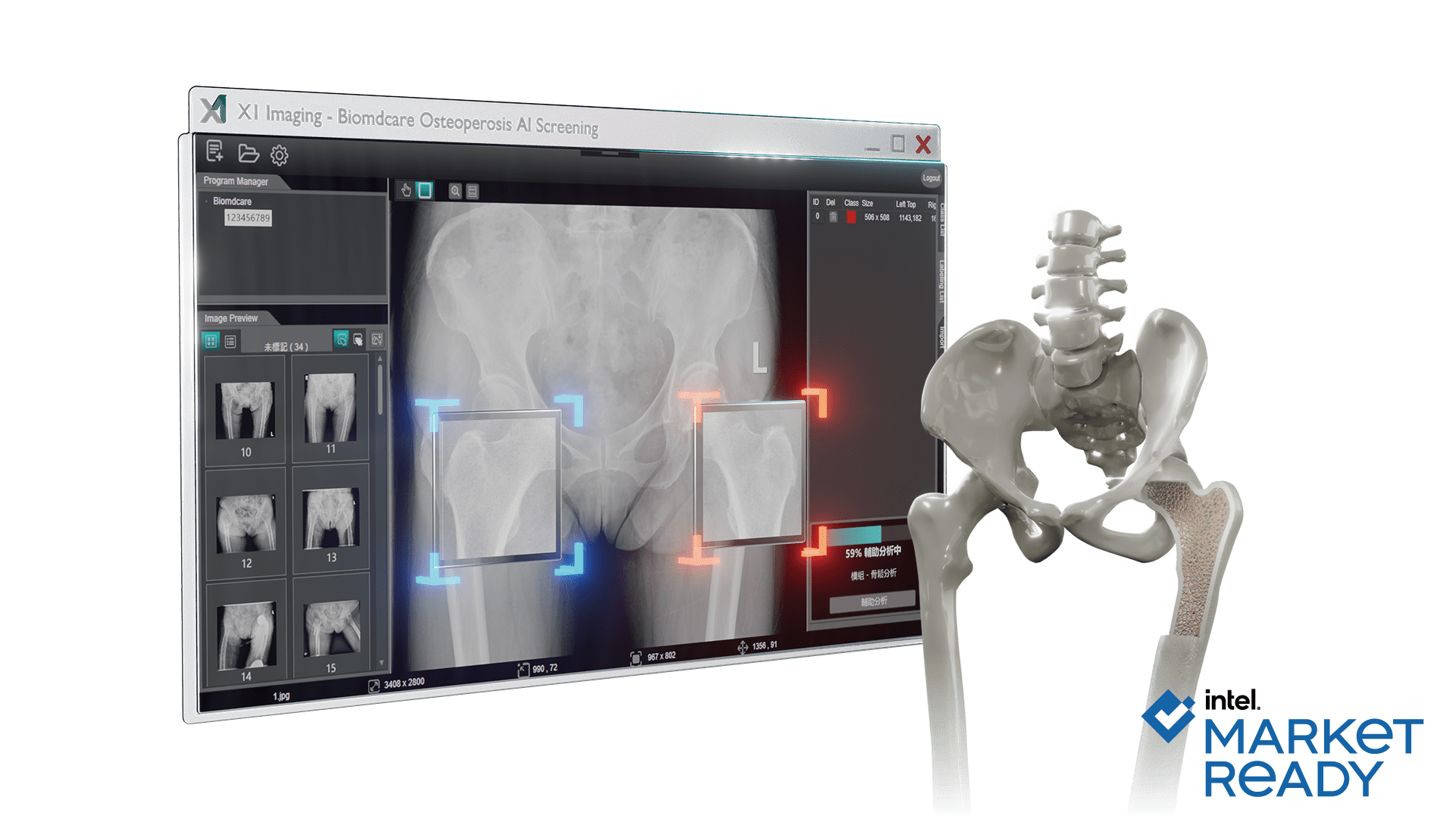Phần mềm phân tích hình ảnh, chẩn đoán loãng xương “Biomedica” X1 tên tiếng anh là “Biomedica” X1 Bone densitometer Solution (Mode: X1-O10), là phần mềm được sử dụng để đọc các hình ảnh y tế do máy quét X-quang xuất ra và hỗ trợ phân tích nguy cơ loãng xương bằng cách tính mật độ khoáng của xương (BMD). Dữ liệu kết quả có thể hỗ trợ các bác sĩ chẩn đoán loãng xương, xác định nguy cơ gãy xương và các triệu chứng khác dẫn đến mật độ xương thấp